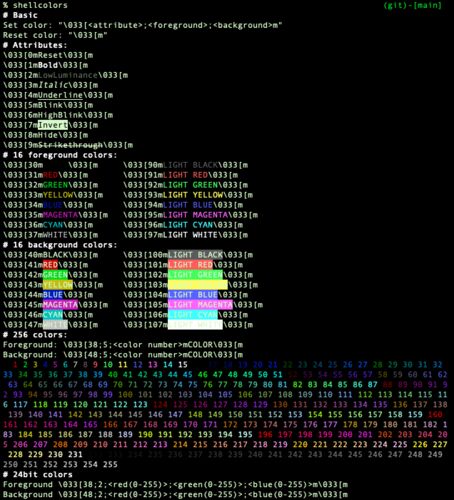 題の通りのやつをサクっとできるようにscriptにした.echoしているだけで工夫が全然無いけど事足りるっぽい. zshrcとかに書いておくなどする. ######### shellcolors ############ function shellcolors () { echo -e "\033[1m# Basic\033[m" echo -e "Set…